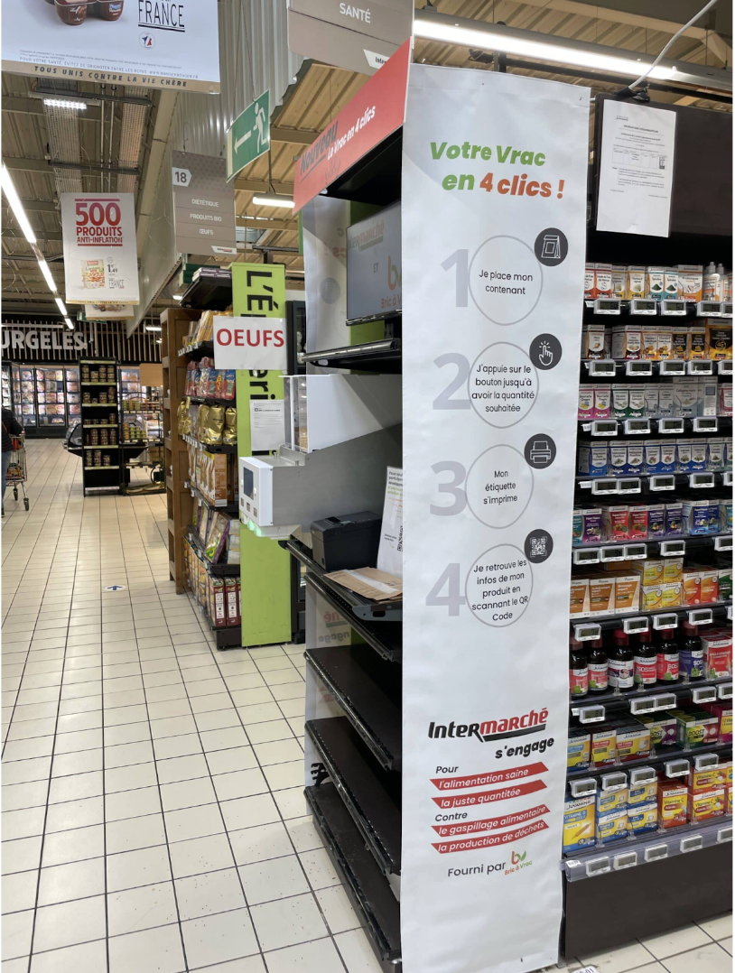 As shoppers fill their bags or containers, they can see how much the fill costs and weighs, just like a gas pump. Bric à Vrac uses reverse logistics to ensure total traceability for shoppers. The information is accessible via QR code on the printed label.