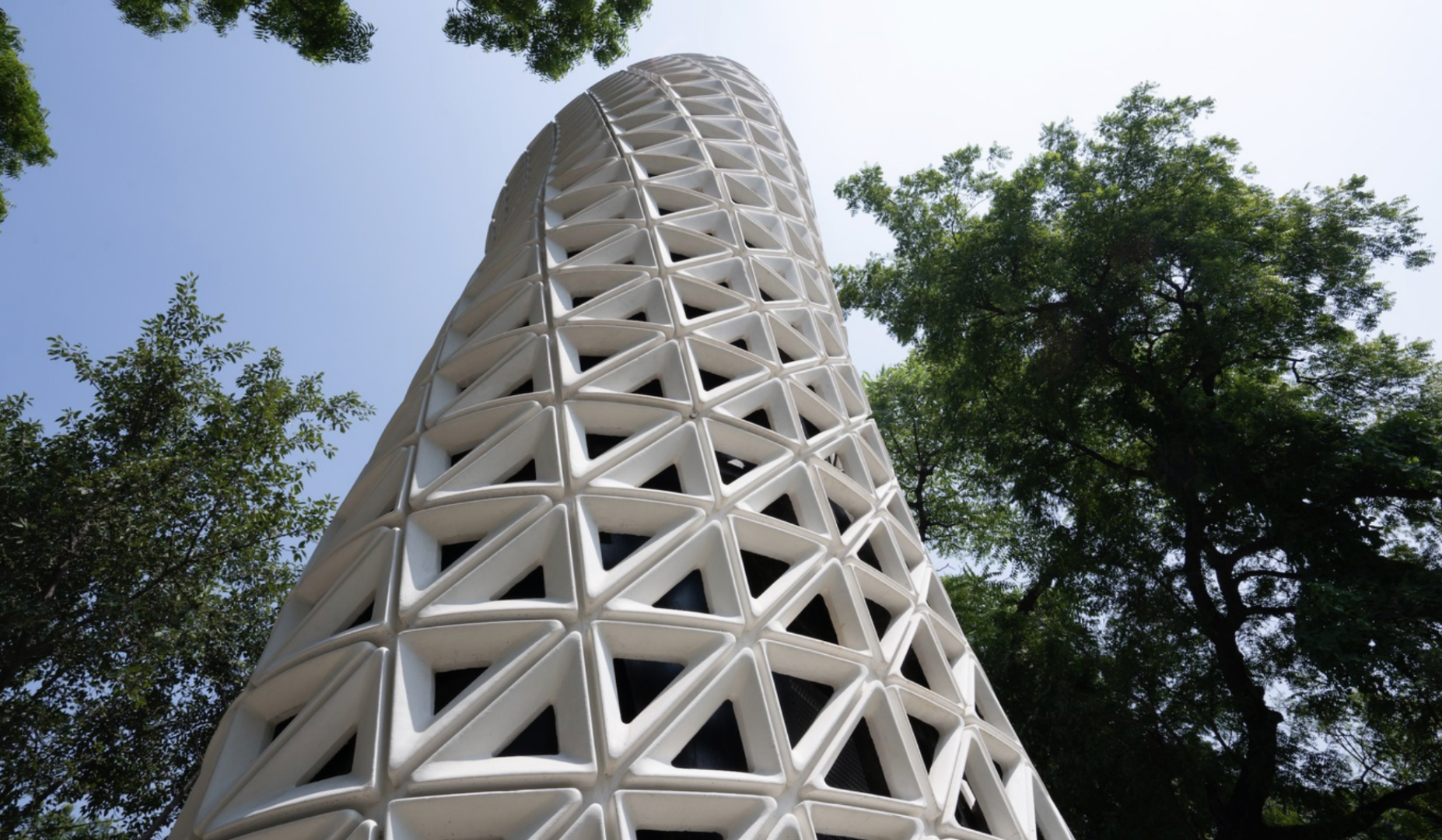 The twisted geometry of the tower helps to create a difference in temperature and pressure between the air coming in and the air going out, resulting in a loop that pulls air towards the tower. Once pulled in, a filtering membrane removes fine airborne particulates before exhaling the cleansed air. The membrane is replaced every six to nine months. A fully modular design allows the concrete panels to be shipped in flat pack form ready to be assembled on site.