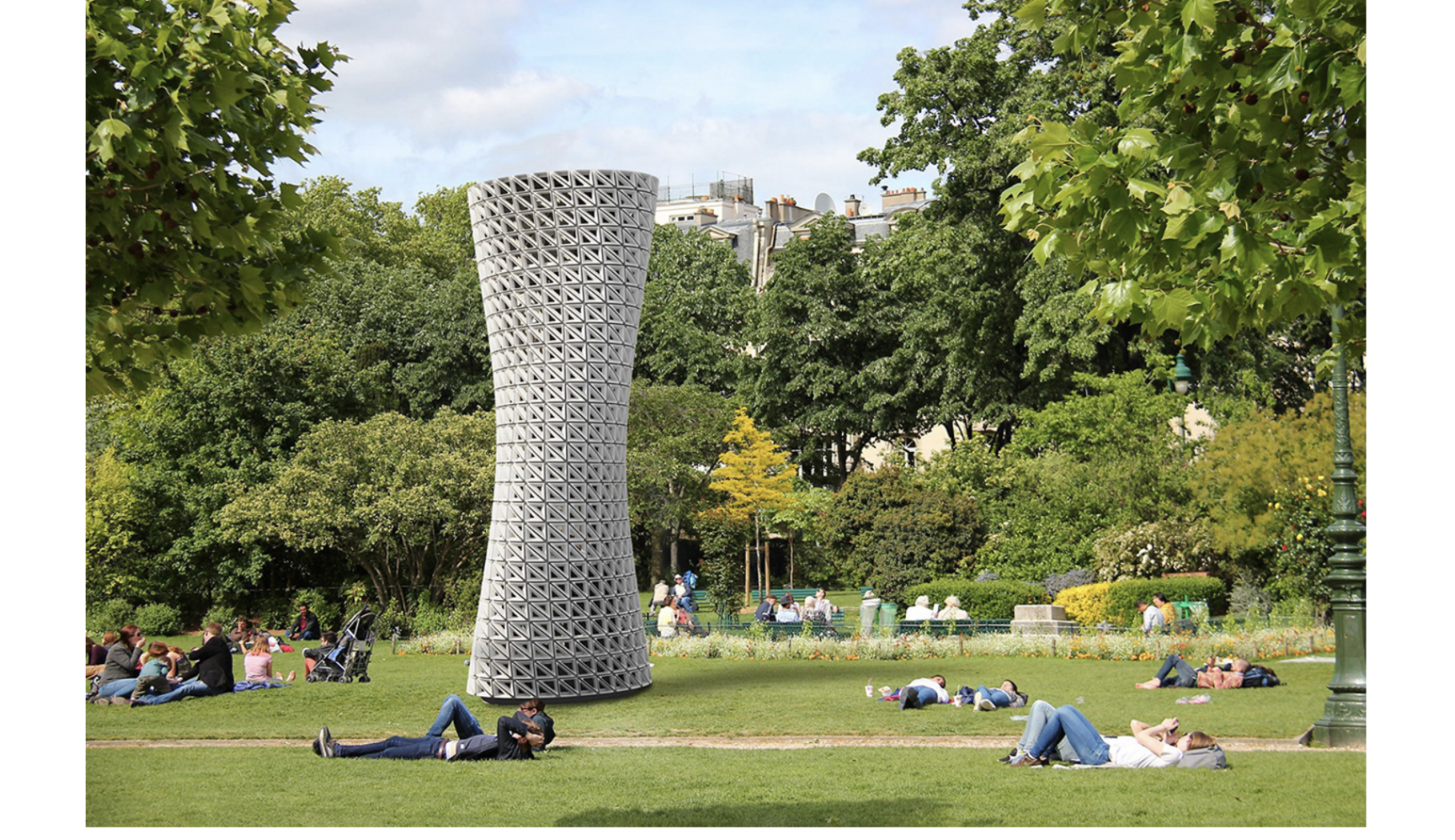 Enter Verto, a 5.5m tall tower designed with the aid of a computer to optimise the air purification surface area, thereby maximising the amount of clean air it outputs. Studio Symbiosis claim that this is up to 600,000 cubic metres of air per day, while also heavily reducing levels of nitrogen dioxide and fine particulate matter.