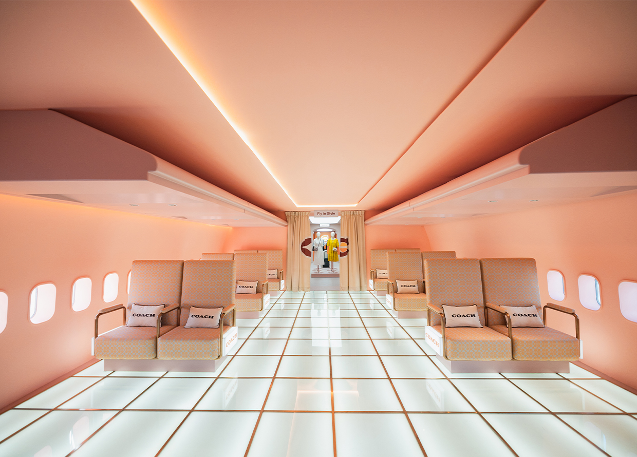 The brand’s recent Coach Airways store offers a perfect example of this approach in action. Instead of occupying a regular storefront in Malaysia’s Freeport A’Famosa Outlet shopping mall, the brand hosted a pop-up on board a decommissioned Boeing 747 outside. The space is reached via an air bridge, with customers given a realistic-looking boarding pass to gain access. Vintage design features in the interior aim to transport visitors back to the golden age of aviation in the 1950s. A café serving in-flight snacks heightens the nostalgia even further.